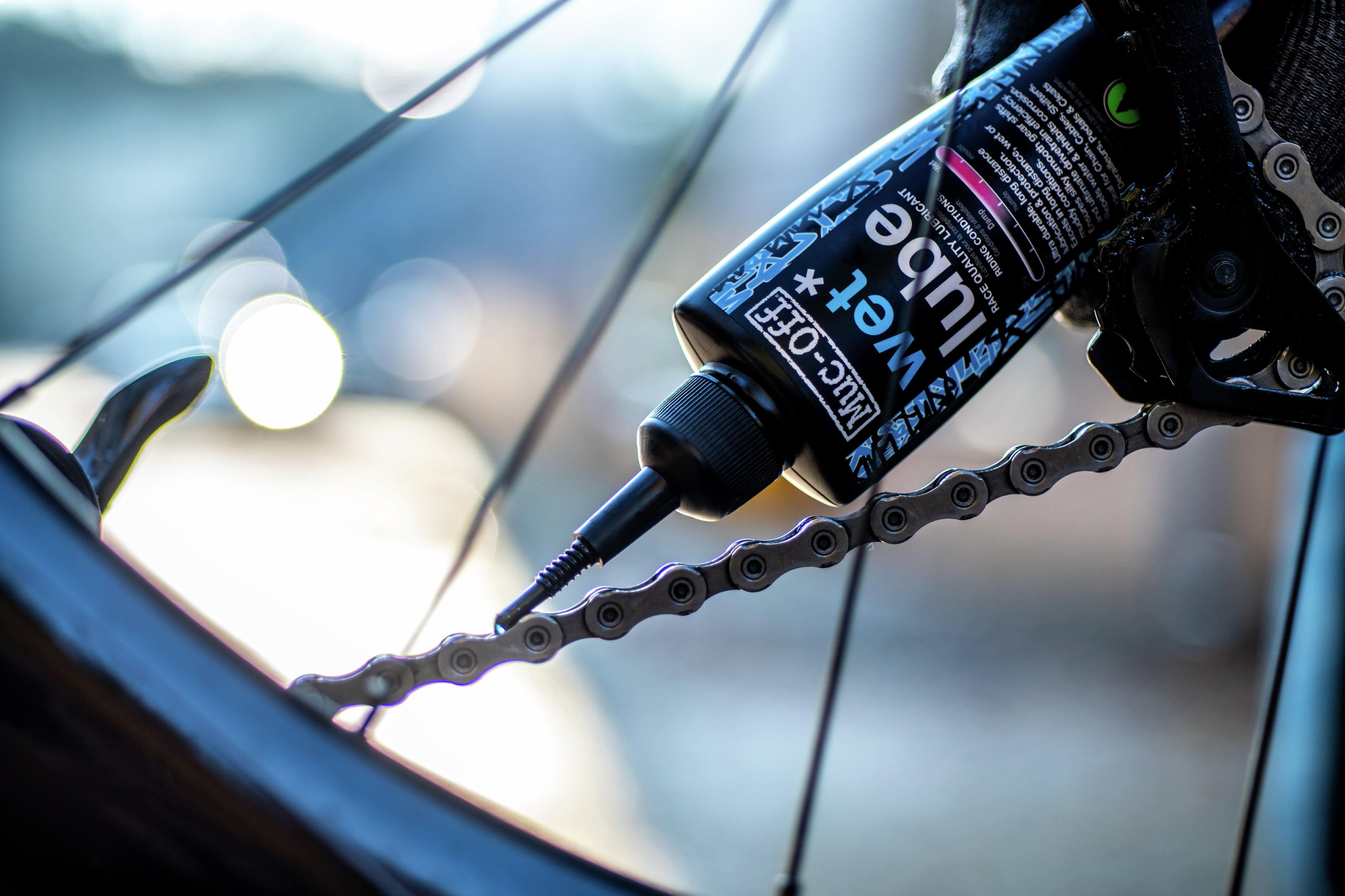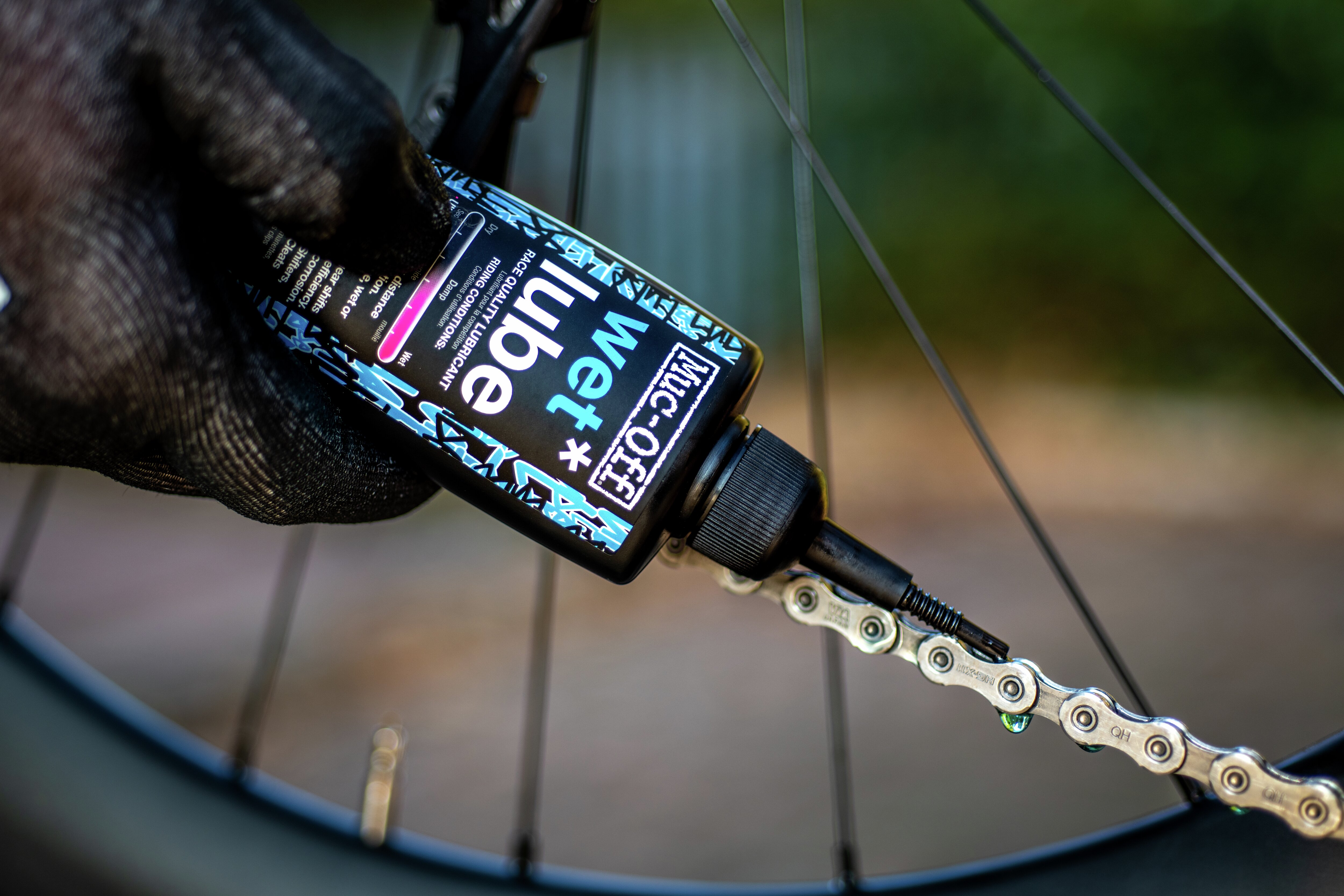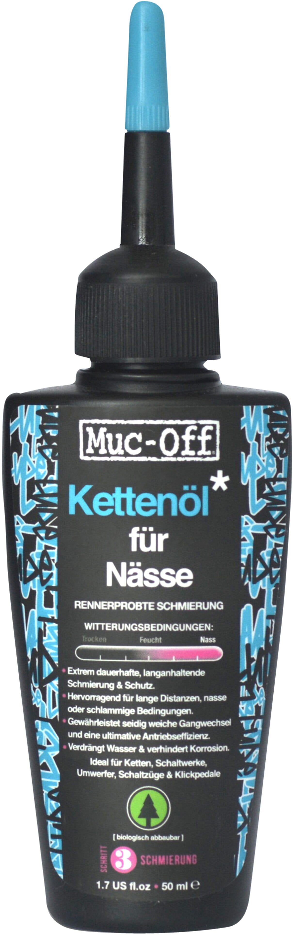 Muc-Off’s „Wet Lube“ ist ein extrem strapazierfähiges und langlebiges Kettenöl. Die rennerprobte Schmierung eignet sich speziell für feuchte, nasse und matschige Bedingungen. Seine stark hydrophoben Eigenschaften halten Wasser und Feuchtigkeit von der Kette ab. Dadurch bleibt die Schmierleistung auch bei widrigsten Bedingungen bestehen.