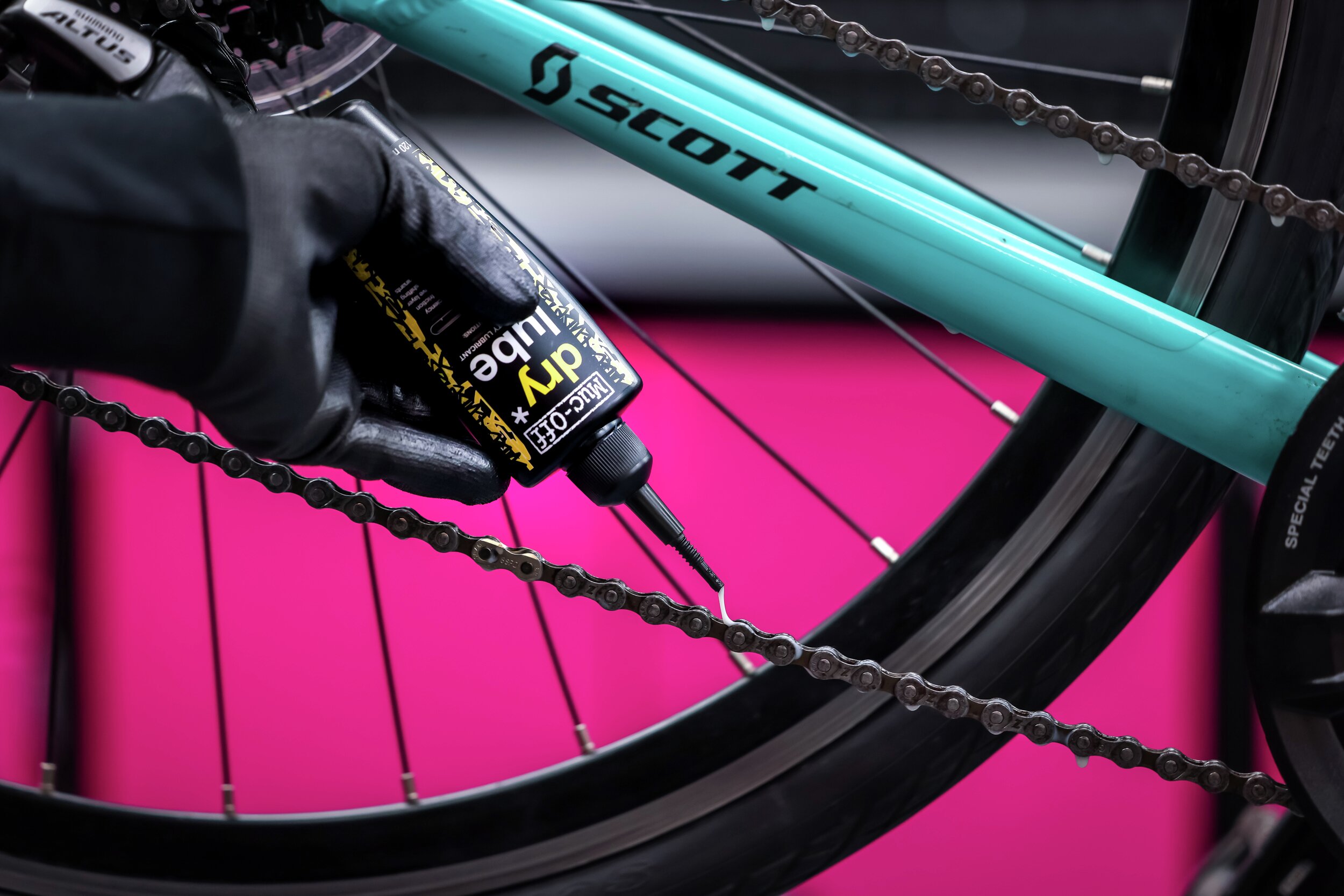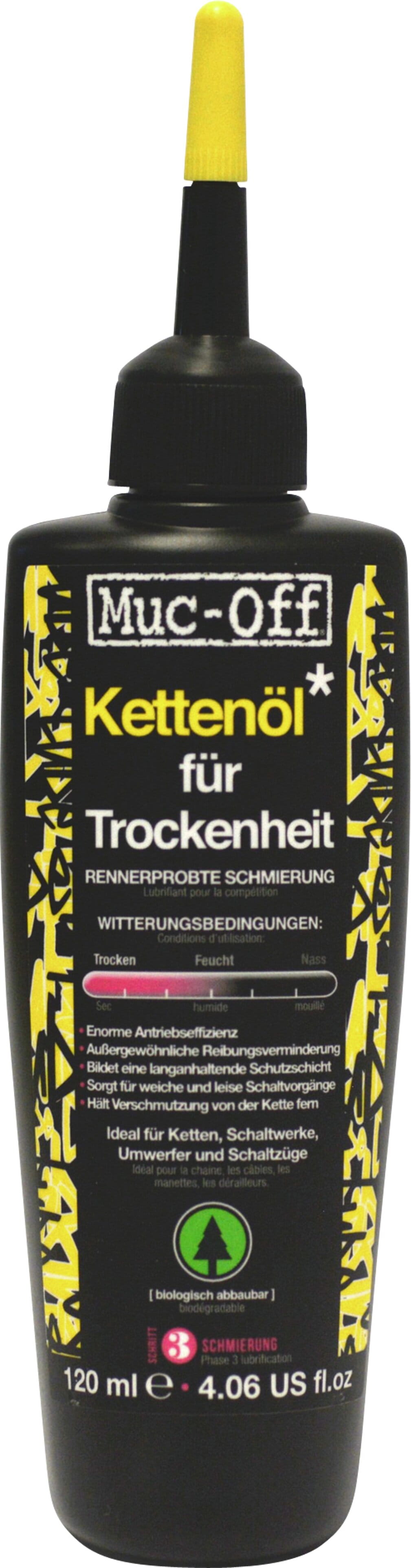 Muc-Off’s Kettenöl für Trockenheit bietet eine rennerprobte Schmierung in trockenen bis leicht feuchten Bedingungen. Die spezielle Zusammensetzung ist bezieht die Kette mit einem Schutzfilm, an dem Staub und Schmutzpartikel nicht haften können. Das sorgt für leisen und weichen Lauf der Kette und vermindert den Verschleiss enorm. Es ist biologisch abbaubar und somit freundlich zur Umwelt. Vor Gebrauch die Kette von Fett- und Ölresten befreien.