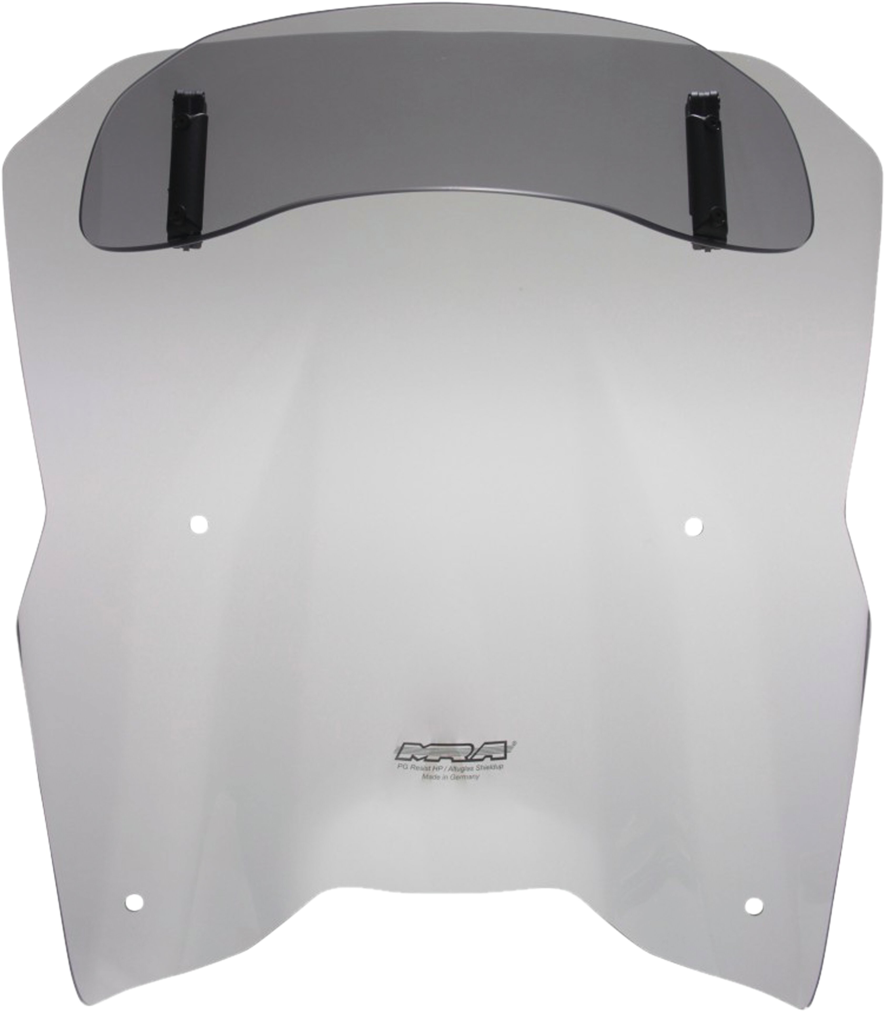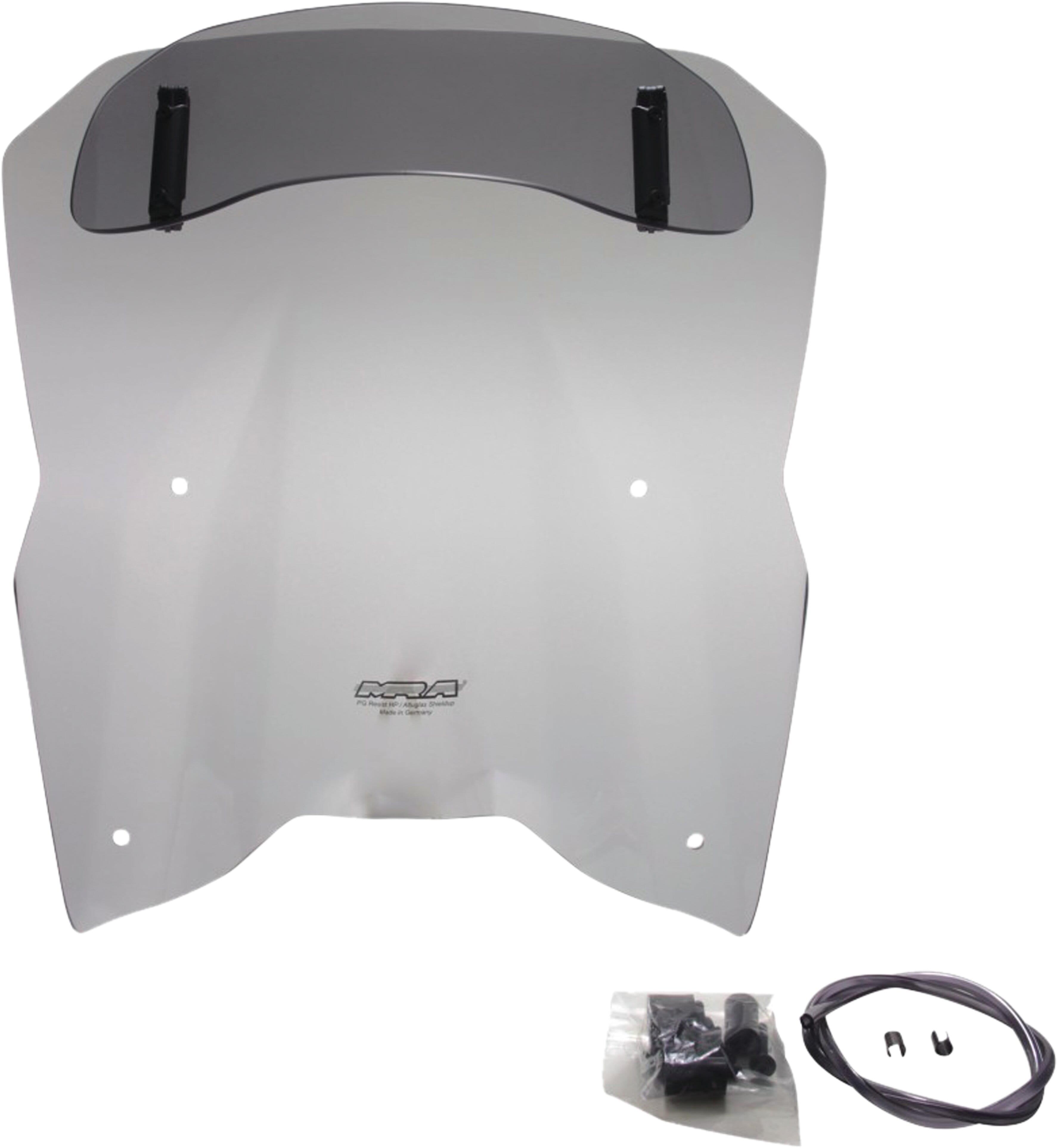 Diese Tourenscheibe hat am Ende einen Spoiler, der sich manuell in sieben Stufen auf die gewünschte Position verstellen lässt. Durch die Hinterströmumg des Spoilers wird der Winddruck vom Fahrer genommen und gleichzeitig die Turbulenzen reduziert. Die Vario- Touringscreen ist in klar und rauchgrau erhältlich.