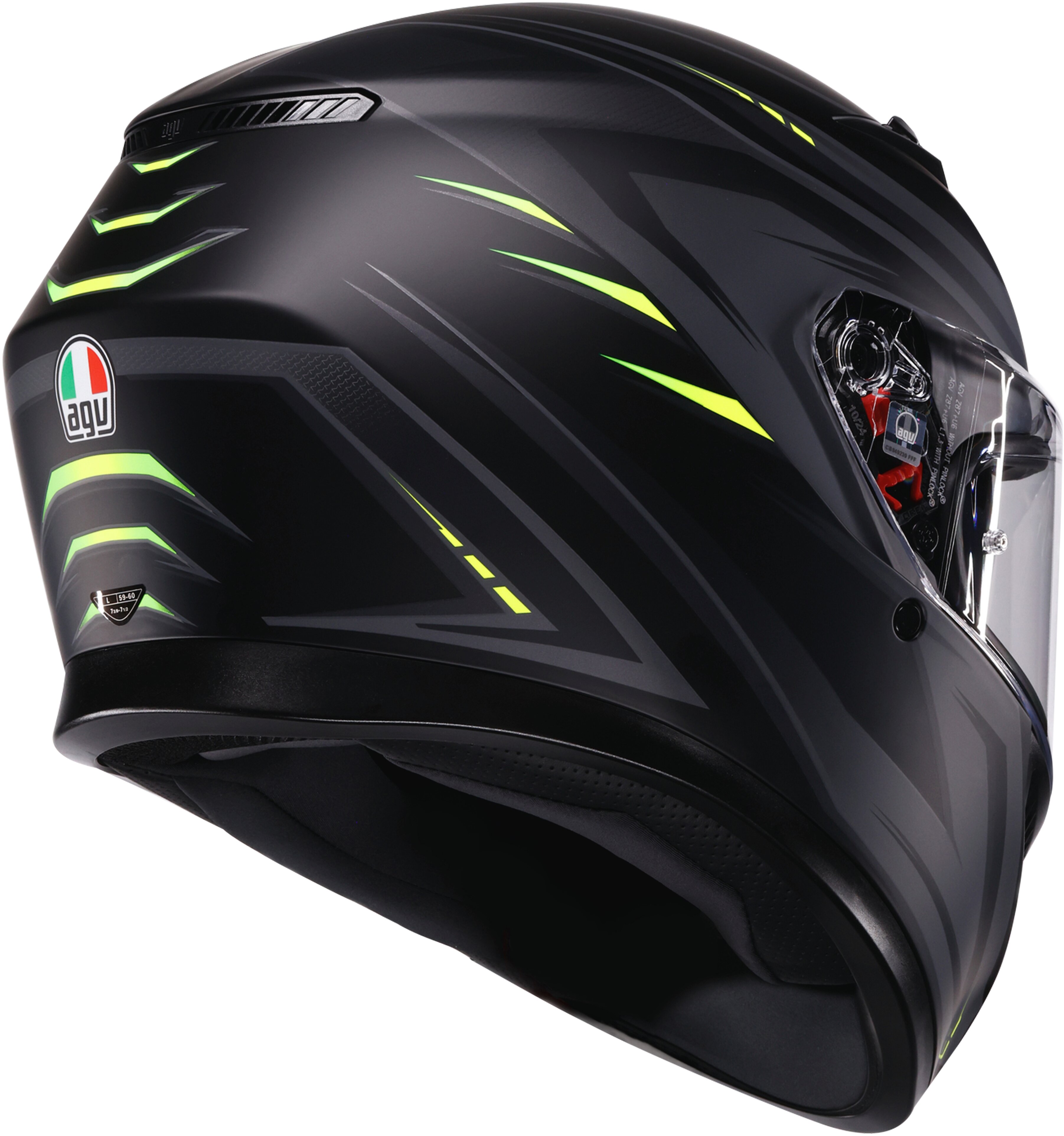 Sicherheit für alle, auf höchstem Niveau: Die Schale aus hochfestem Thermoplast, das EPS mit hoher Dichte und Details wie das Schlüsselbeinschutzprofil sowie das Schutzvisier ermöglichen es dem K3, die strenge Zulassungsnorm ECE 22.06 zu erfüllen. Dank des AGV Extreme Safety-Designprotokolls übertrifft der K3 die Anforderungen der neuesten internationalen Normen bei Weitem.