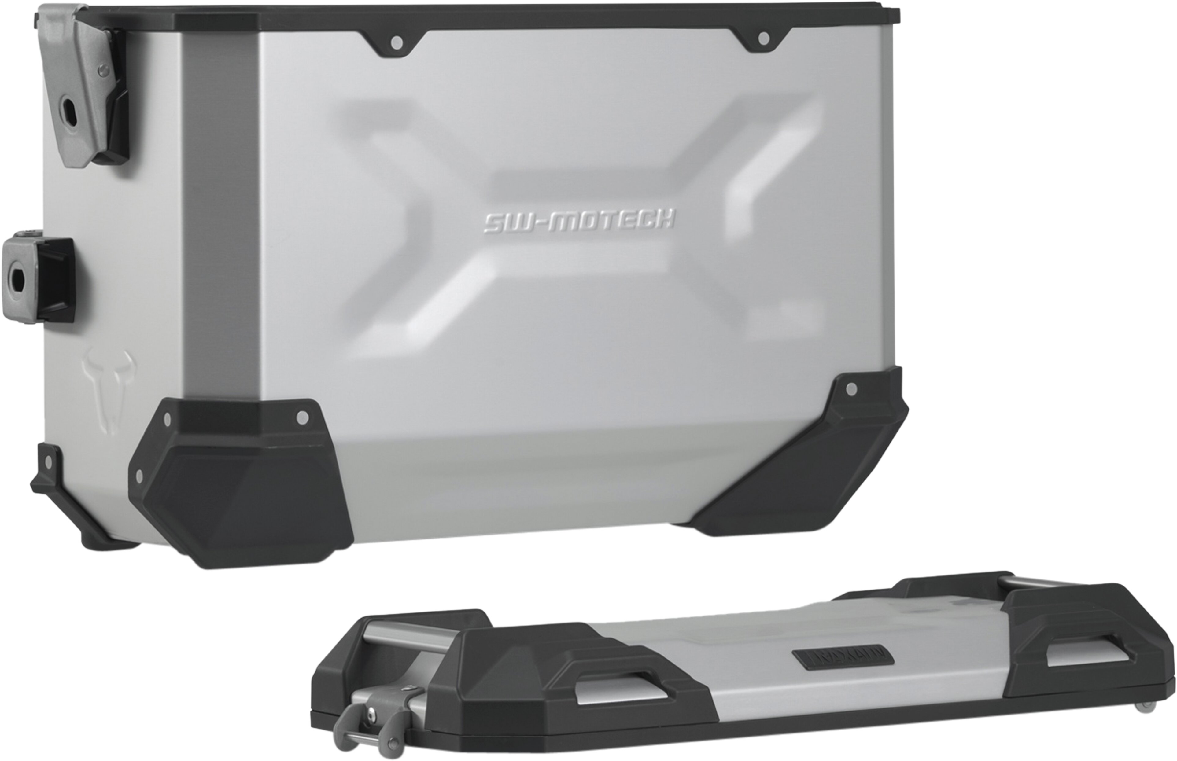 Die robusten TRAX ADV Alukoffer fühlen sich auf jeder Strecke zuhause: Designprägungen unterstützen die Stabilität des 1,5 Millimeter starken, geschweissten Aluminium-Wandmaterials. Ein komplett abnehmbarer Deckel mit Tragegriffen aus eloxiertem Aluminium und Schnellverschlüssen erleichtert Be- und Entladen der Motorradkoffer, die abgeschrägte Seitenkante gibt hohe Bodenfreiheit bei der Kurvenfahrt. Mit dieser Komplettlösung hast du alle benötigten Komponenten, um direkt mit TRAX auf grosse Reise zu gehen: Zwei wasserdichte TRAX ADV Seitenkoffer, zwei abnehmbare SW-MOTECH Seitenträger, Adapterkit, Schloss-Satz, Öffnungsbegrenzer und Diebstahlsicherung zum attraktiven Gesamtpreis. Die modellspezifischen Träger und die Grösse der Koffer sind perfekt auf Heckgeometrie und Auspuffanlage des Motorrades abgestimmt.