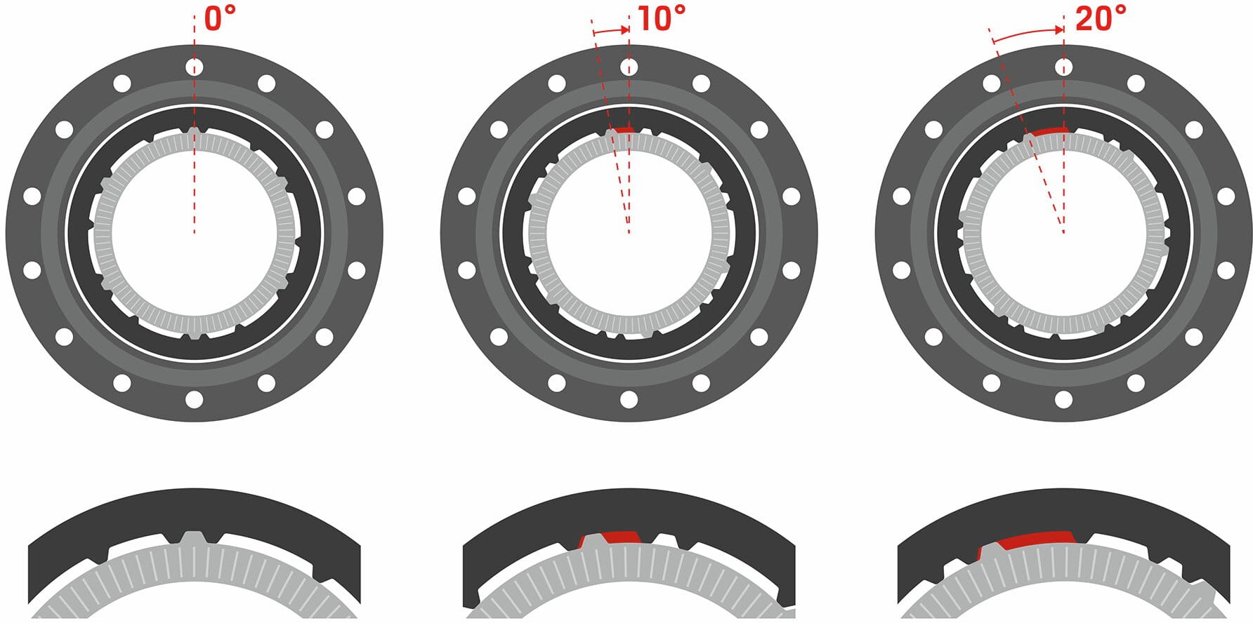 Die neue DF-Technologie gegen Pedalrückschlag ist extrem einfach gestaltet. Sie lässt sich auch nachträglich mit allen Ratchet DEG-Freilaufsystemen kombinieren und ist leichter als andere Lösungen. Ersetze einfach den Gewindering an der Nabe sowie die beiden Zahnscheiben, und schon stehen dir drei verschiedene Freiheitsgrade zur Verfügung: 0°, 10° und 20°.