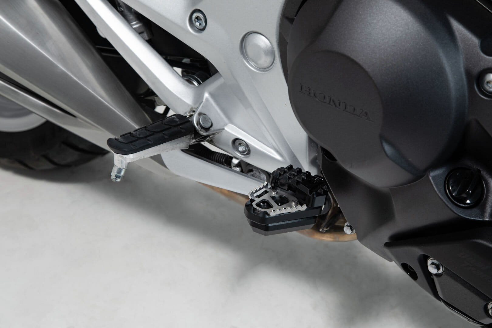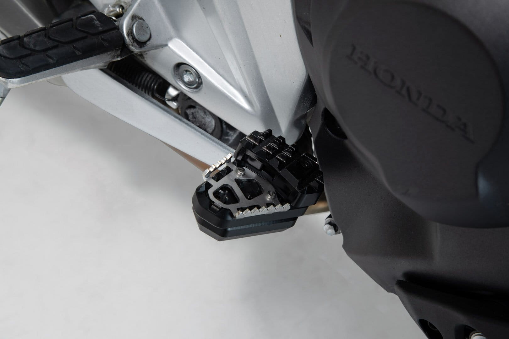 SW-MOTECH fertigt die Erweiterungen aus gefräster und hochfester Aluminiumlegierung mit schwarz eloxierter Oberfläche und mit einem Auftrittsblech in Edelstahl. Für eine optimale Anpassung an die Ergonomie lässt sich die Erhöhung des Bremshebelauftritt in zwei Stufen von 22 oder 27 Millimetern einstellen.