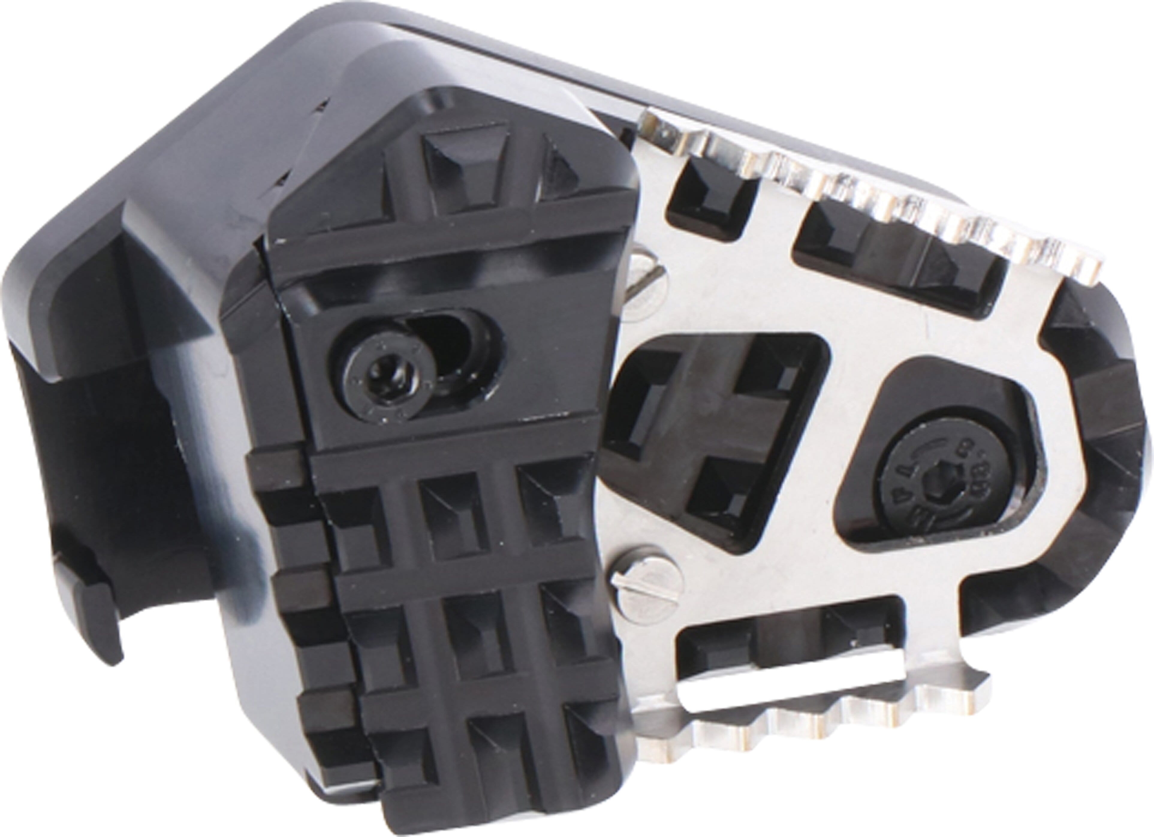Zusätzlich zur Erhöhung verfügt die FuÃbremshebel-Erweiterung über eine verbreiterte Auflagefläche. Diese ist mit einer gezahnten Oberfläche versehen und bietet dadurch besseren Halt bei verschmutzter oder nasser Oberfläche des Hebels.
