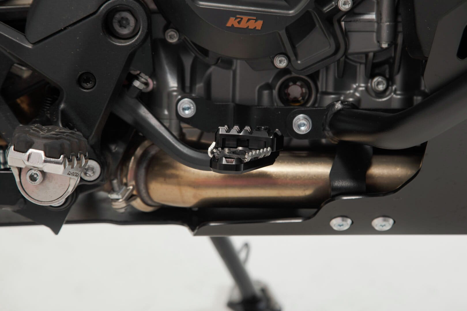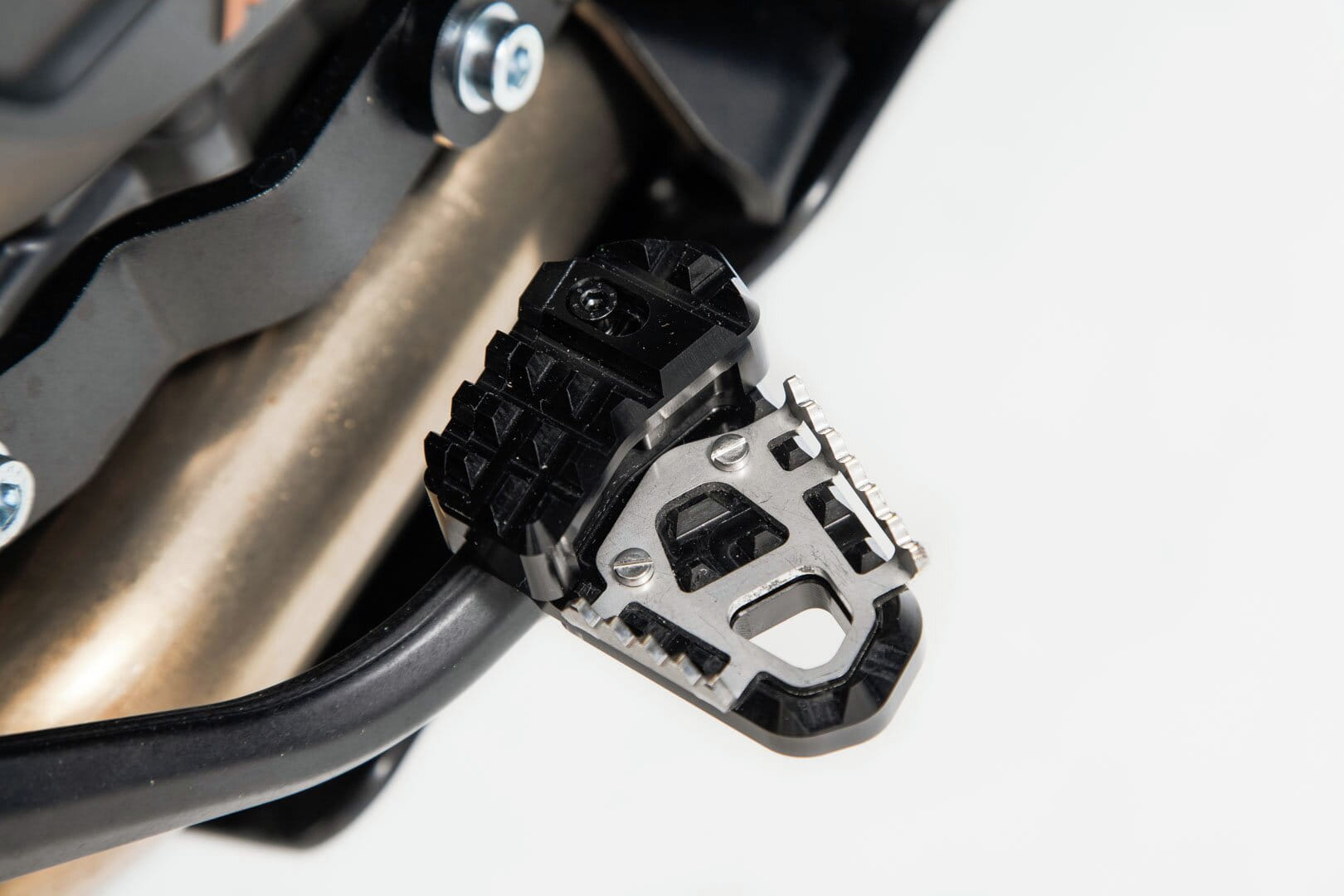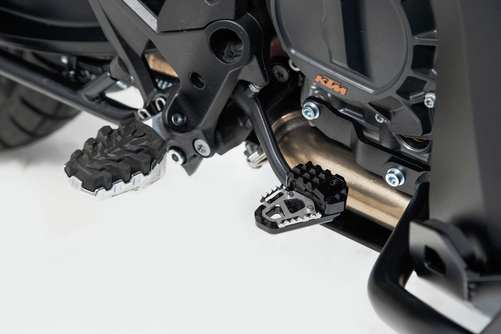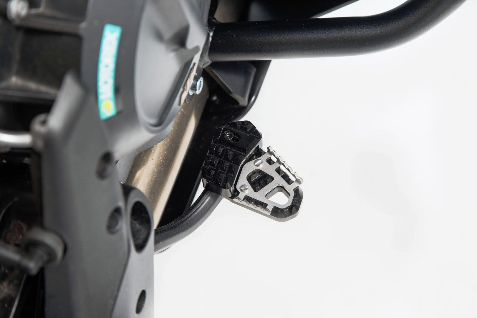 SW-MOTECH fertigt die Erweiterungen aus gefräster und hochfester Aluminiumlegierung mit schwarz eloxierter Oberfläche und mit einem Auftrittsblech in Edelstahl. Für eine optimale Anpassung an die Ergonomie lässt sich die Erhöhung des Bremshebelauftritt in zwei Stufen von 22 oder 27 Millimetern einstellen.