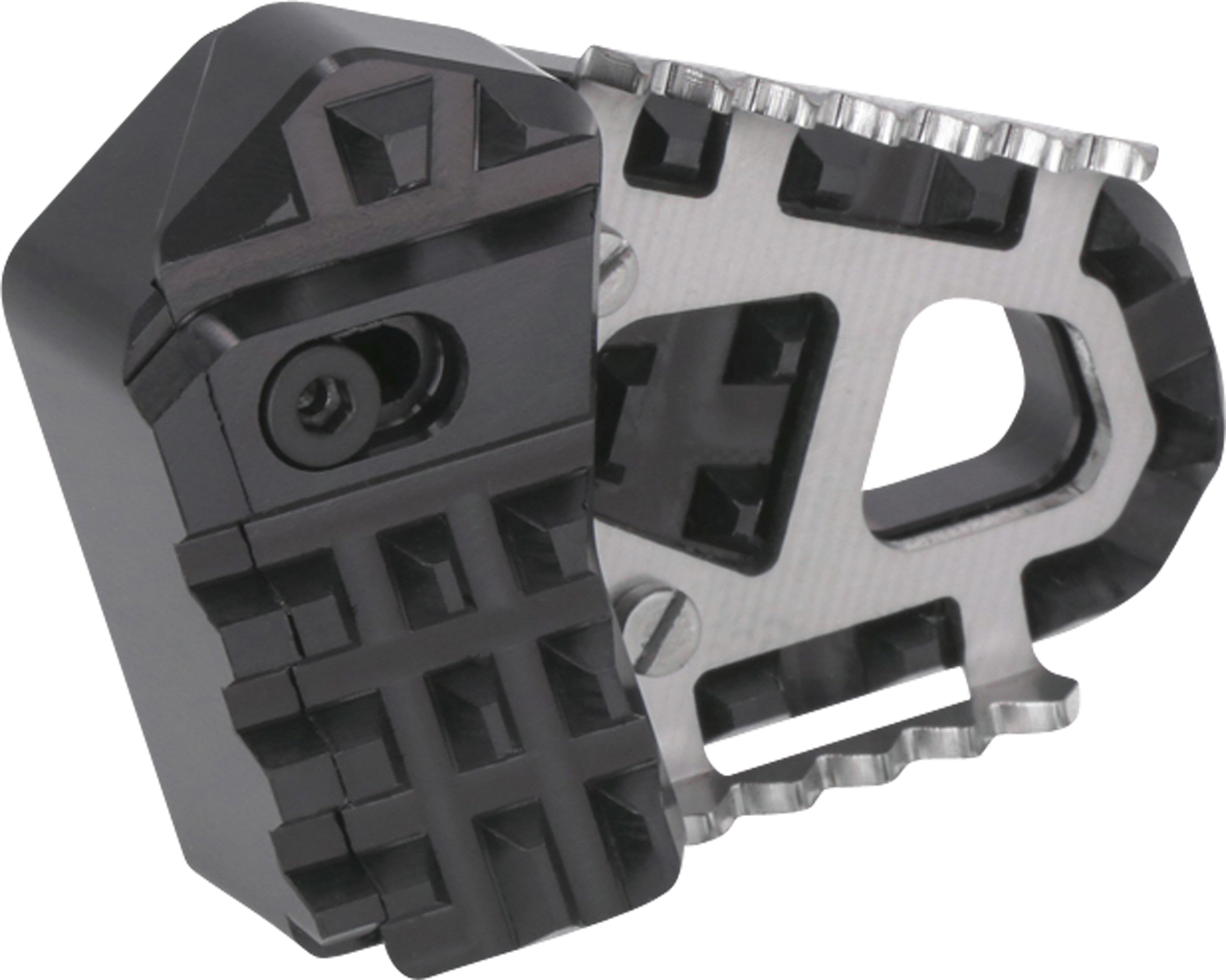 Zusätzlich zur Erhöhung verfügt die Fußbremshebel-Erweiterung über eine verbreiterte Auflagefläche. Diese ist mit einer gezahnten Oberfläche versehen und bietet dadurch besseren Halt bei verschmutzter oder nasser Oberfläche des Hebels.