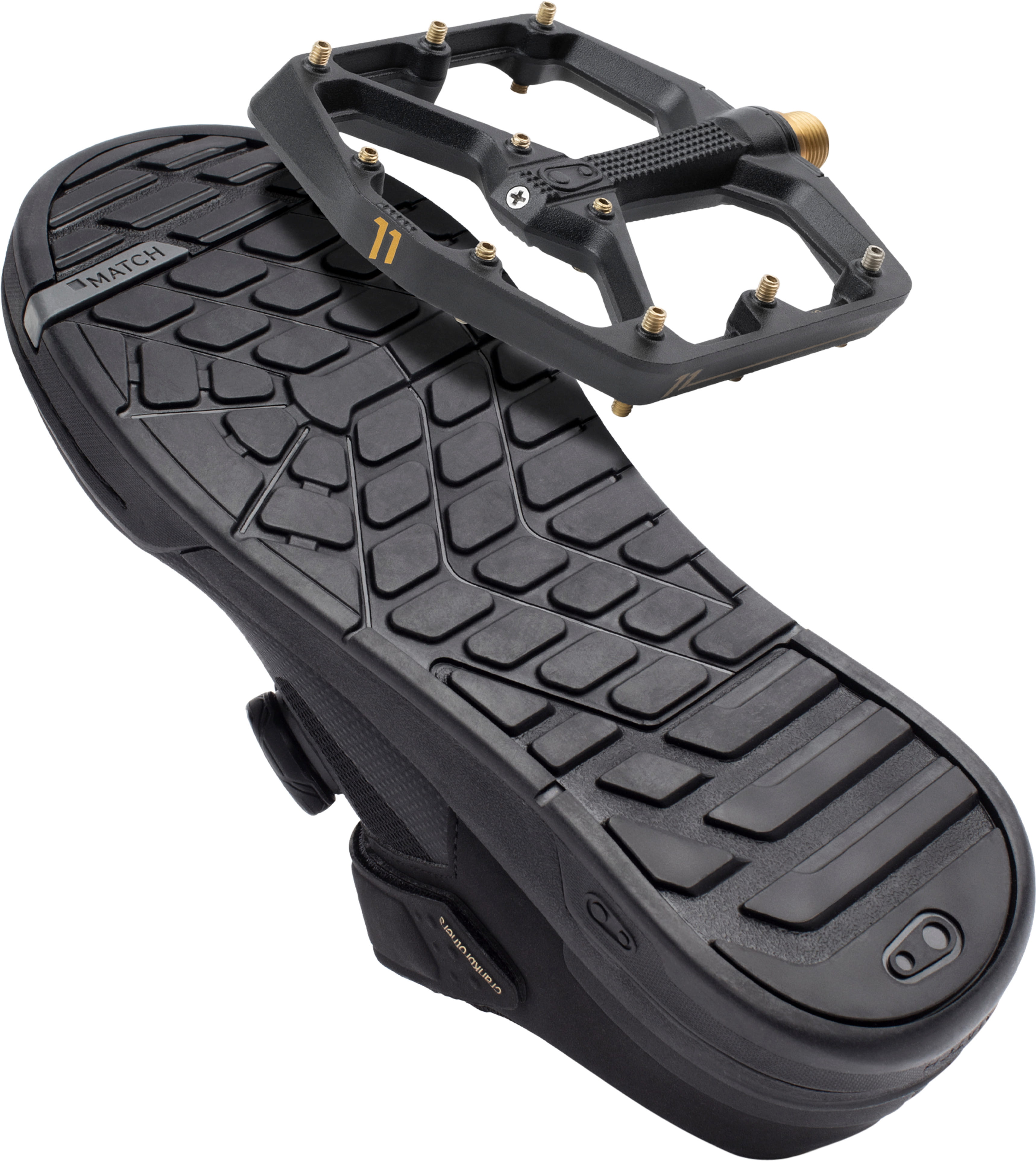 Unser innovatives MATCH-System ist ein Designansatz, der das Pedal und den Schuh als einheitliches System betrachtet, um eine optimierte Schnittstelle bereitzustellen. Crankbrothers Stamp-Schuhe sind für unsere Pedale optimiert, funktionieren jedoch mit jedem MTB-Flat-Pedal. Das Profil der Außensohle ist für maximale Kontaktfläche und Kompatibilität mit der Pedalplattform ausgelegt. Darüber hinaus ist die Stollentiefe um die Pin-Dimensionen herum gestaltet, um den Pin-Körper zu absorbieren.
