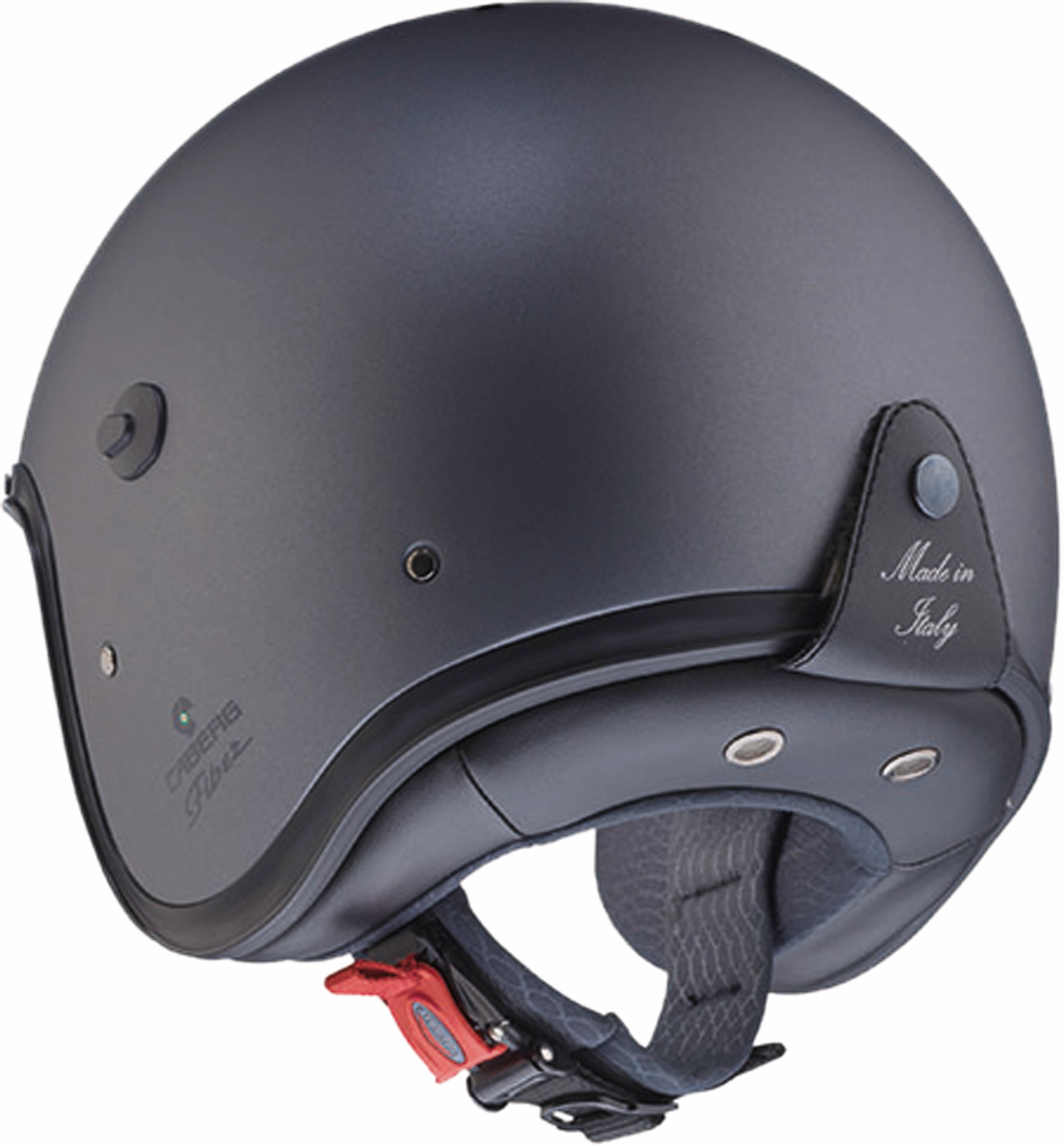 Die sehr kompakte Helmschale – eine der kleinsten auf dem Markt – wiegt nur etwa 800 g und lässt sich selbst in den schmalsten Staufächern unterbringen. Die vollständig italienischen Verarbeitungsdetails (wie die fünf in den Schalenrand eingelassenen Nieten, die siebgedruckte Brillenlasche, die Stahl-Lüftungsöffnungen im Nackenpolster sowie die Einsätze aus Eco-Leder) unterstreichen die Liebe zum Detail.