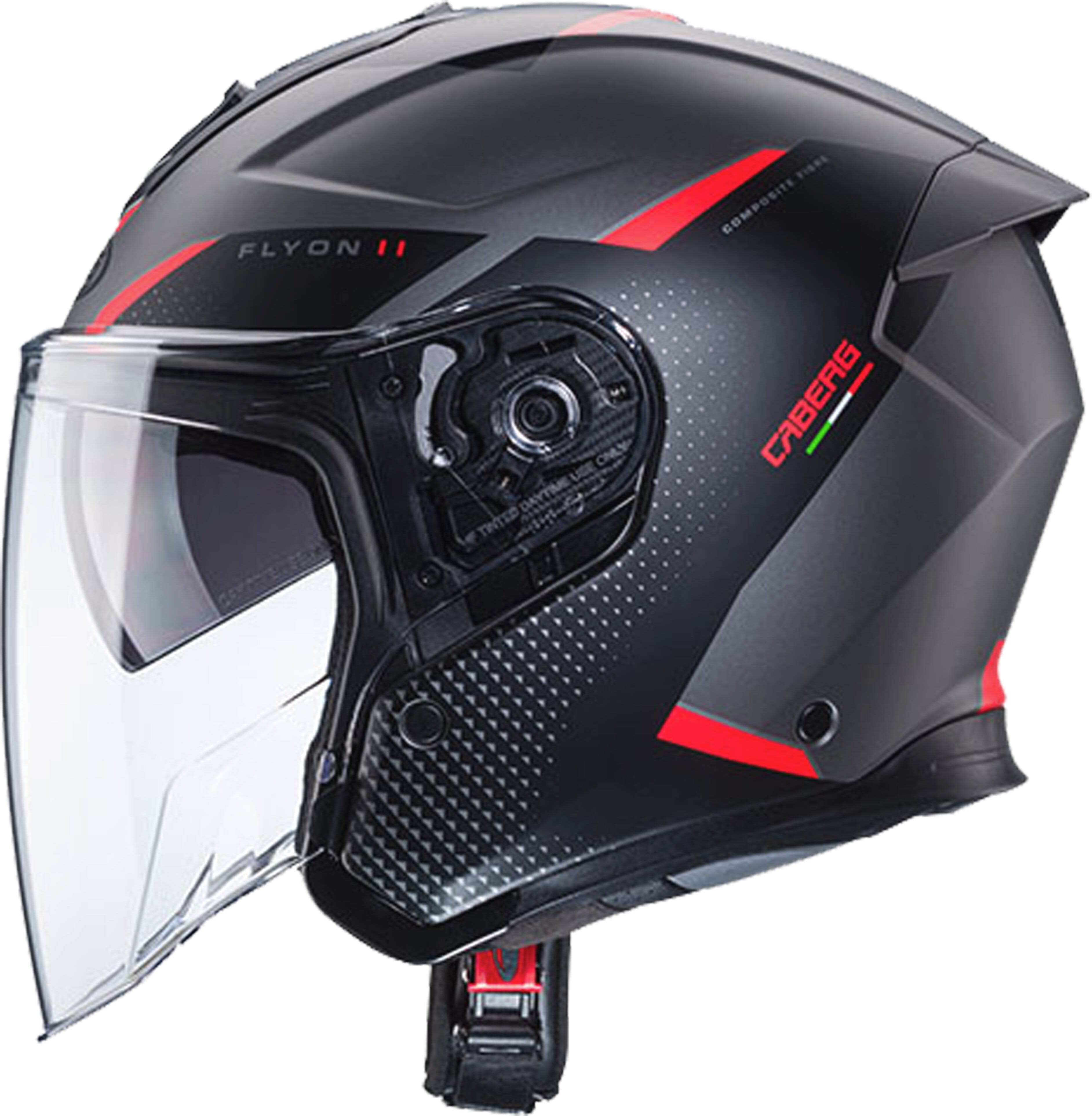 Der FLYON II wird in zwei Schalengrössen gefertigt, um das optimale Verhältnis zwischen Helmgrösse und Fahrergrösse zu gewährleisten. Der Helm ist in Glasfaser- oder Carbon-Ausführung erhältlich. Der FLYON II ist für den Caberg Pro Speak Evo-Kommunikator vorbereitet, der die Kommunikation mit dem Beifahrer ermöglicht und eine Bike-to-Bike-Verbindung bis zu 200 Metern bietet. Ausserdem kann er mit einem GPS verbunden werden und Musik vom Handy oder MP3-Player abspielen. Für maximale Sicherheit hat der FLYON II alle ECE 22.06-Prüfungen auch mit installiertem Pro Speak Evo-System bestanden.