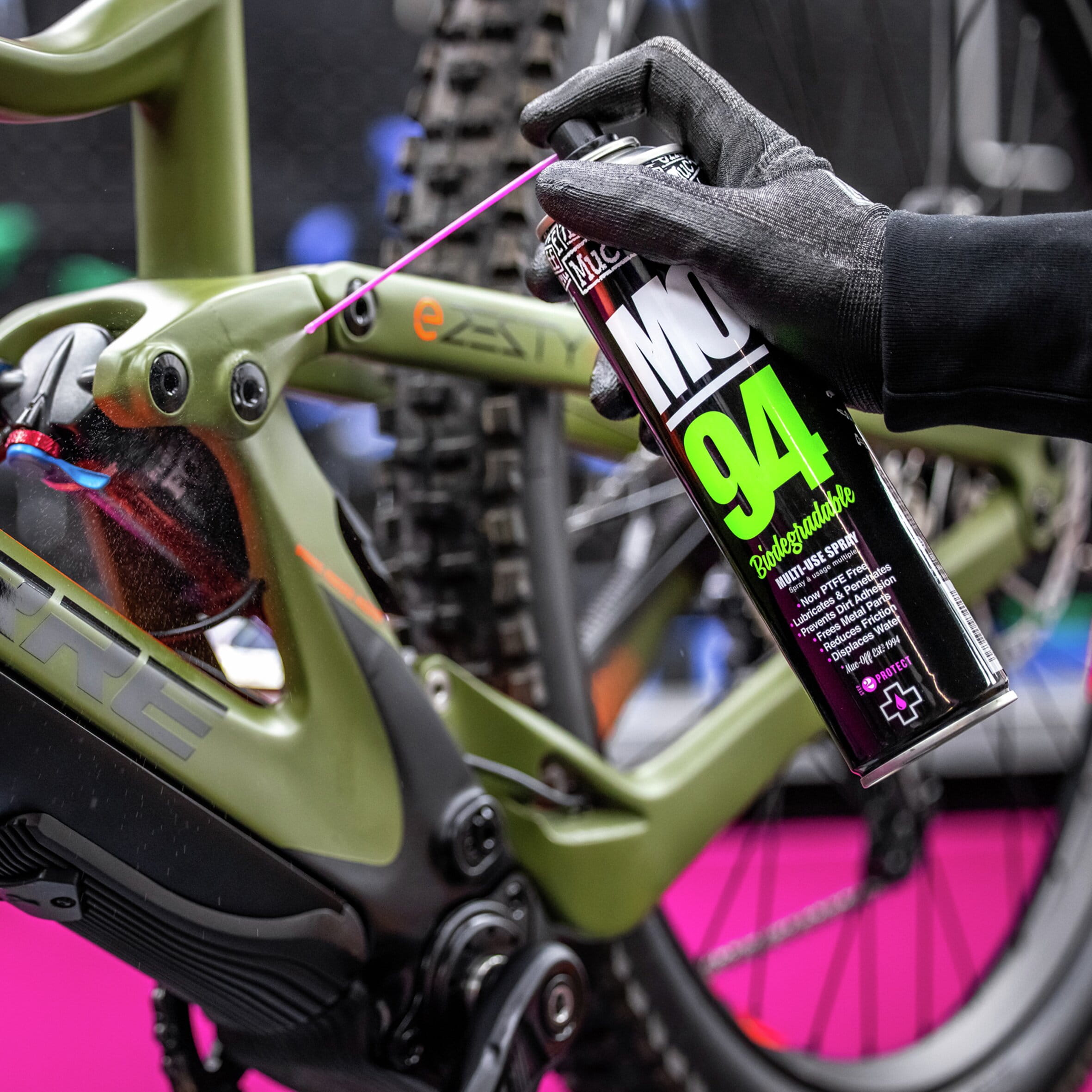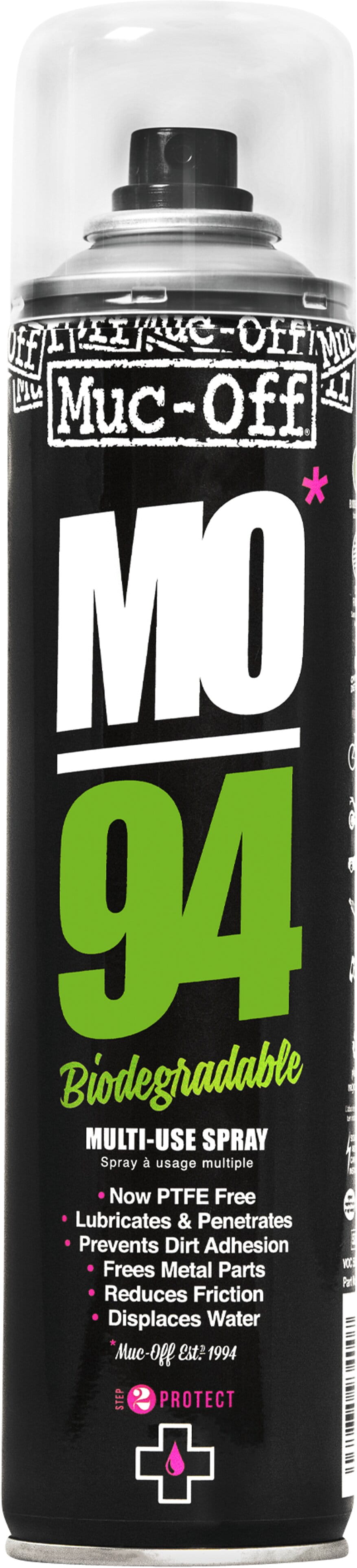 Un spray à tout faire. Le MO-94 ne s’utilise pas seulement sur les motos, vélos ou voitures, comme son homologue du bricolage, il s’utilise à peu près pour tout : une charnière de porte qui grince, une serrure grippée ou un boulon que vous n’arrivez pas à dévisser… Avec saformule à base de PTFE, Muc-Off MO-94 : Protège les pièces métalliques et prolonge leur durée de vie, Chasse l'humidité pour éviter la rouille et la corrosion futures, Lubrifie les pièces en métal, réduit la friction et augmente les performances, Pénètre la rouille accumulée, S’utilise sur toutes les pièces en métal, le plastique et la peinture, Laisse un film protecteur qui réduit l'adhérence de la saleté et espace donc les lavages, Excellent pour le nettoyage chrome.