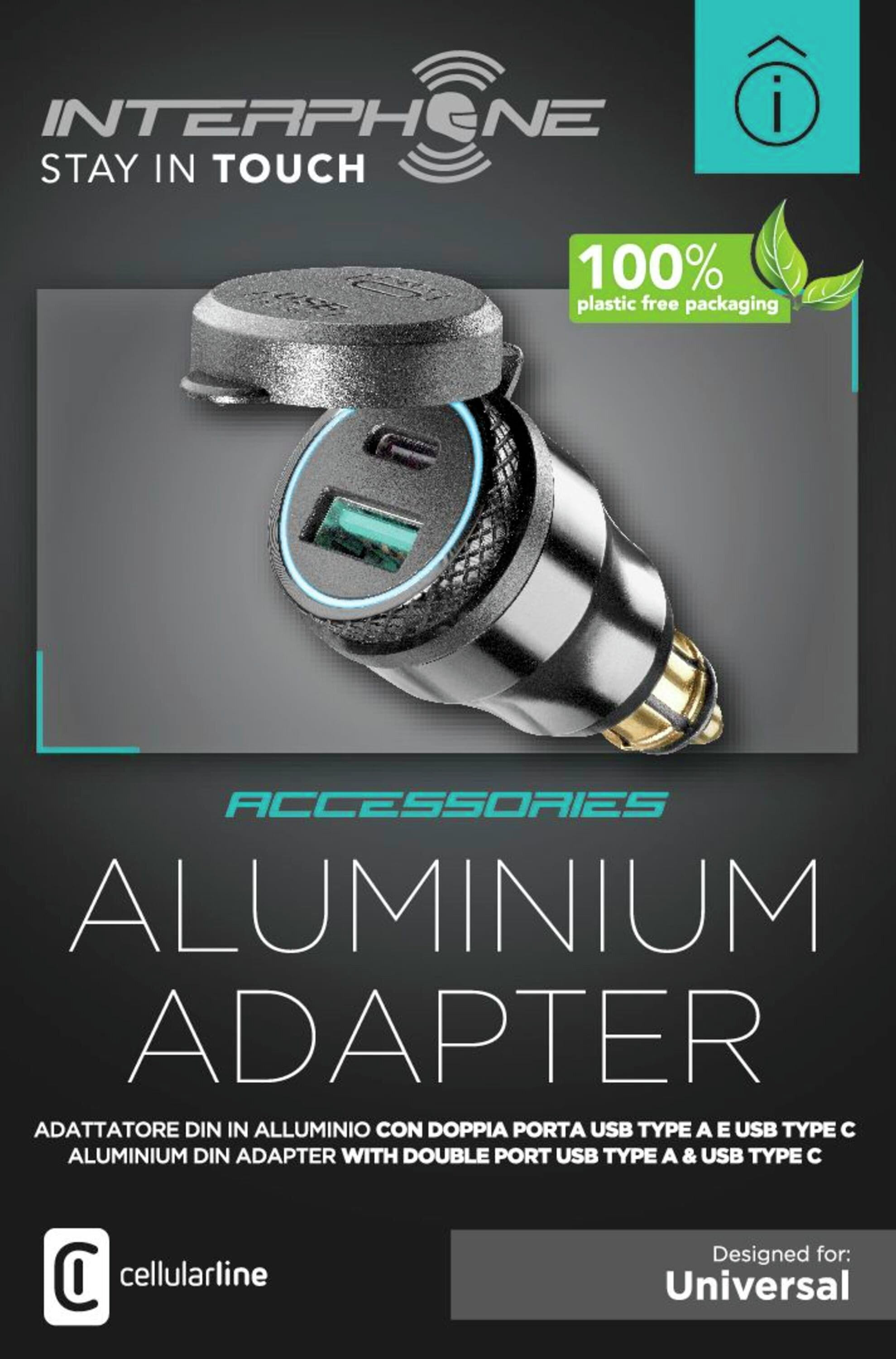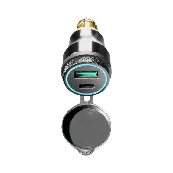 L'adaptateur DIN est équipé de deux ports USB en aluminium, un port de type C et un port de type A, et permet de charger simultanément deux appareils électroniques. Grâce au port de type C, le chargement de vos appareils est rapide et efficace, même pendant le trajet. Très petit et compact, il est doté d'un capuchon de protection et est pratique ainsi que sans fil. Le boîtier est entièrement en aluminium pour résister aux conditions météorologiques.