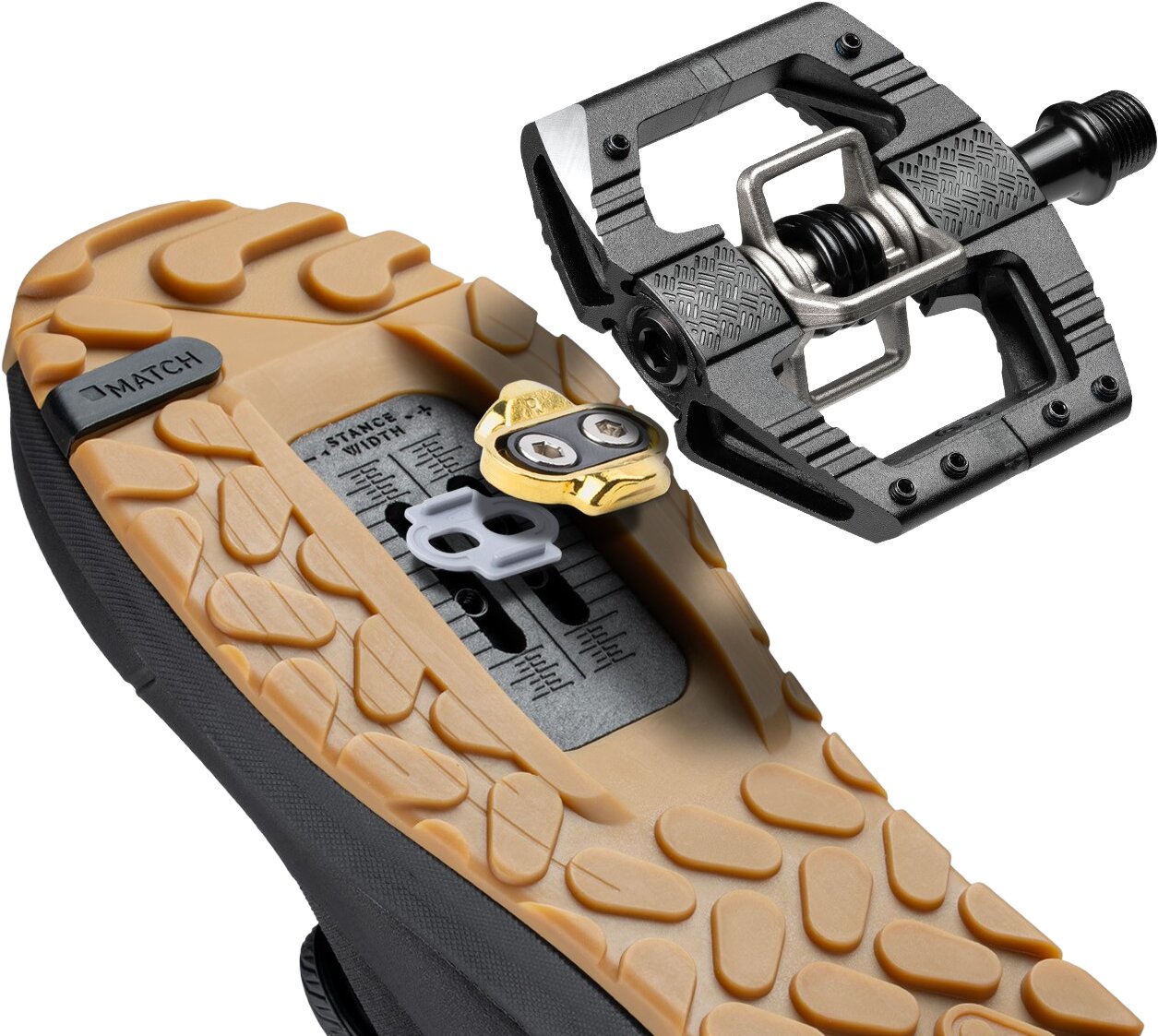 L'innovant système Match optimise l'engagement pour tous les systèmes de fixation de VTT, qu'il s'agisse de Crankbrothers ou de SPD. Elles sont livrées avec la cale Match et la cale Crankbrothers préinstallées en position neutre, de sorte qu'elles sont prêtes à rouler avec les pédales Crankbrothers dès leur sortie de l'emballage.