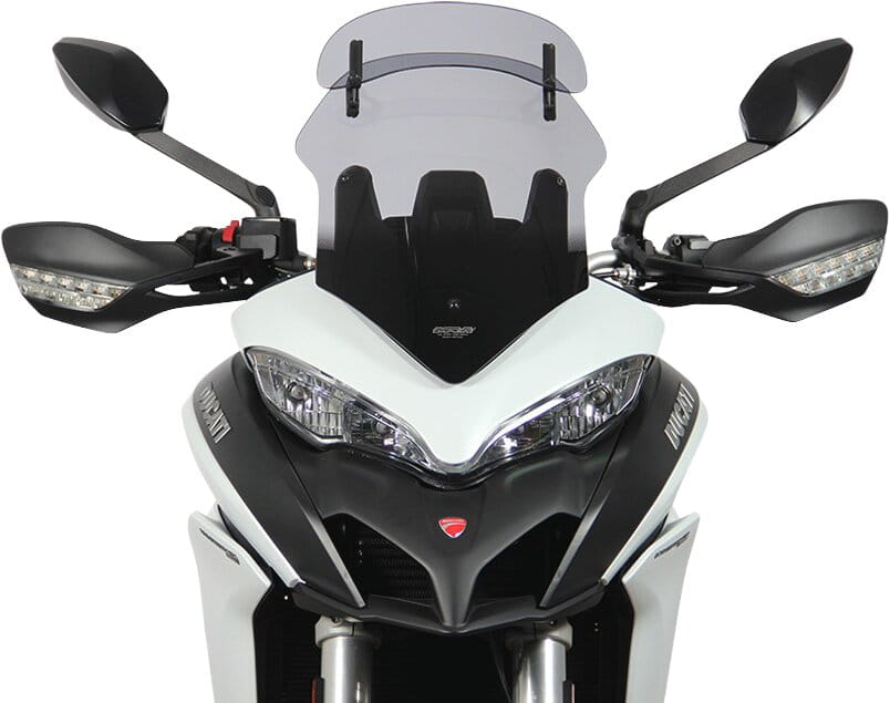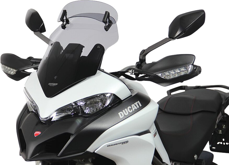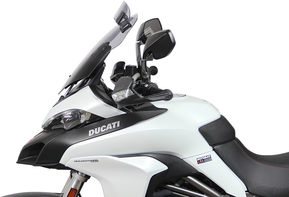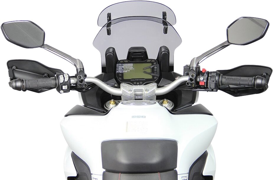 Ce pare-brise de touring est équipé d'un spoiler à l'extrémité, qui peut être ajusté manuellement en sept positions pour atteindre la position souhaitée. Grâce à l'écoulement d'air derrière le spoiler, la pression du vent sur le conducteur est réduite et les turbulences sont diminuées. Le Vario-Touringscreen est disponible en clair et en gris fumé.