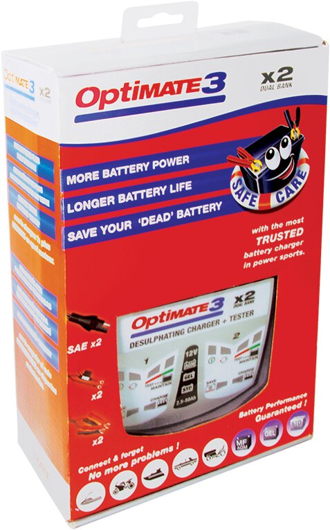 OptiMate 3 x 2, l’outil tout-en-un pour l’entretien de votre batterie 2 x 12 V à la maison. Diagnostique, récupère, charge, teste et entretient de façon optimale votre batterie, et ce, automatiquement. L’OptiMate 3 x 2 conserve toutes les caractéristiques faciles à utiliser des plus de 2 millions de chargeurs OptiMate produits depuis 1995. À présent, il est plus léger et plus efficace que jamais et permet d’entretenir 2 batteries simultanément et de manière indépendante. L’OptiMate 3 x 2 récupère les batteries sulfatées, puis les teste après la charge. Le programme de maintenance distribue la charge uniquement lorsque la batterie en a besoin, jamais de surcharge, jamais déchargée.