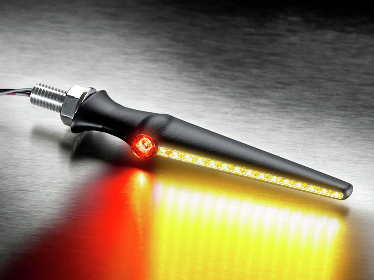 Le Kellermann Jetstream® est probablement le clignotant de moto le plus spectaculaire de tous les temps. Sa forme est extrêmement aérodynamique et donc particulièrement profilée même à des vitesses élevées. Aucun autre clignotant à défilement pour moto homologué ECE n'atteint jusqu'à présent la luminosité du Kellermann Jetstream®. Dans la variante combinée DF, des feux arrière et des feux de freinage tout aussi lumineux sont ajoutés, où la technologie lumineuse Atto® éprouvée est utilisée dans les canaux moteurs.