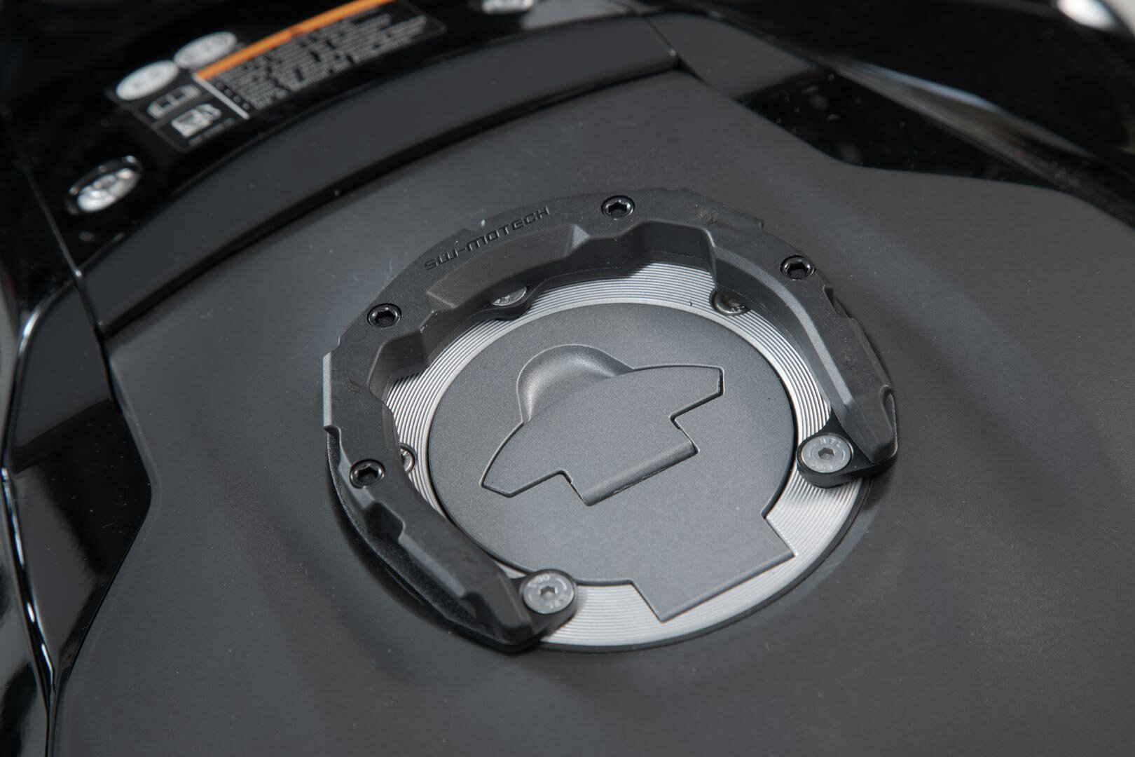 Der patentierte PRO Tankring wird auf den Tankeinfüllstutzen des Motorradmodelles abgestimm t. So kann die bestmögliche Positionierung auf dem Tank gewährleistet werden.